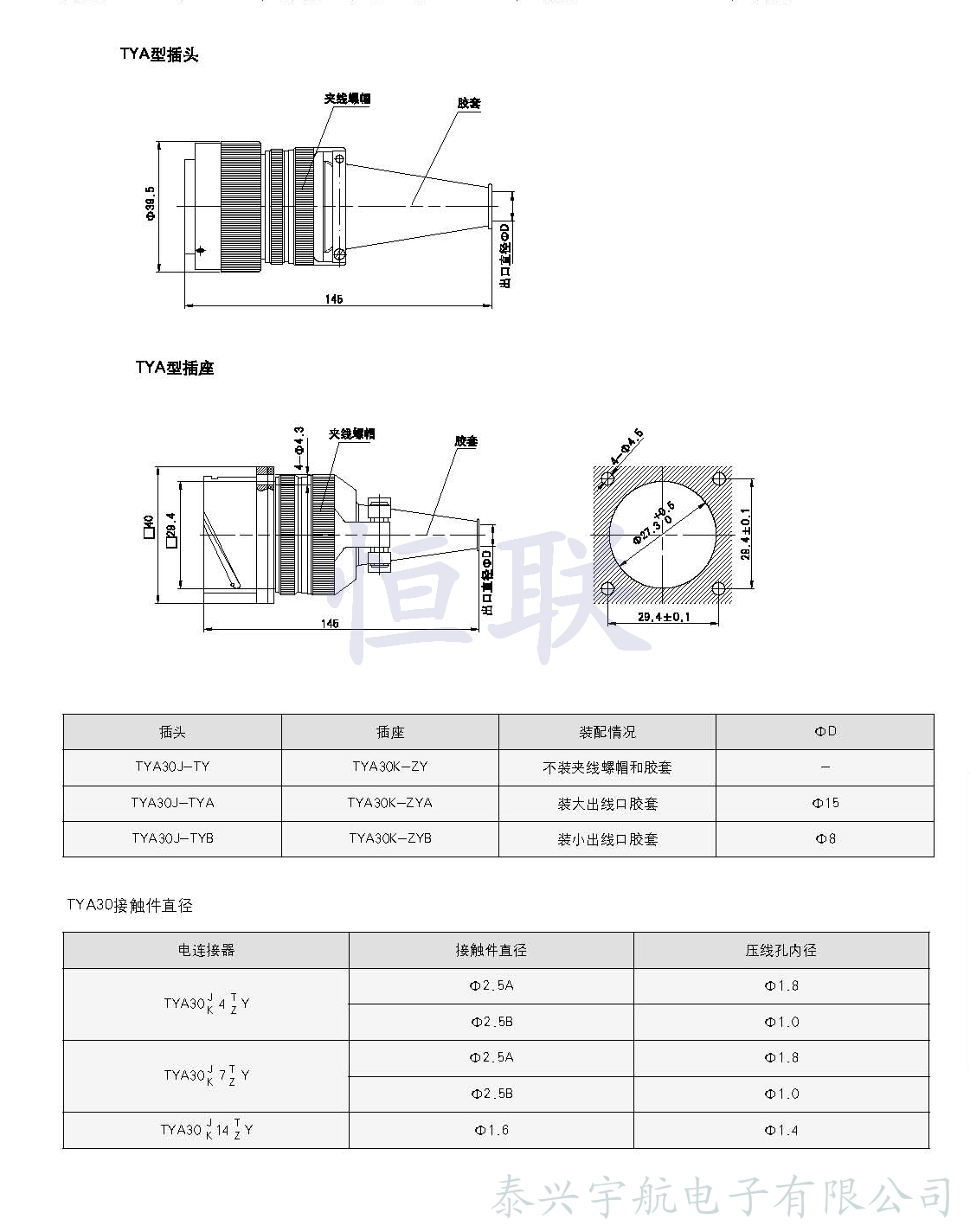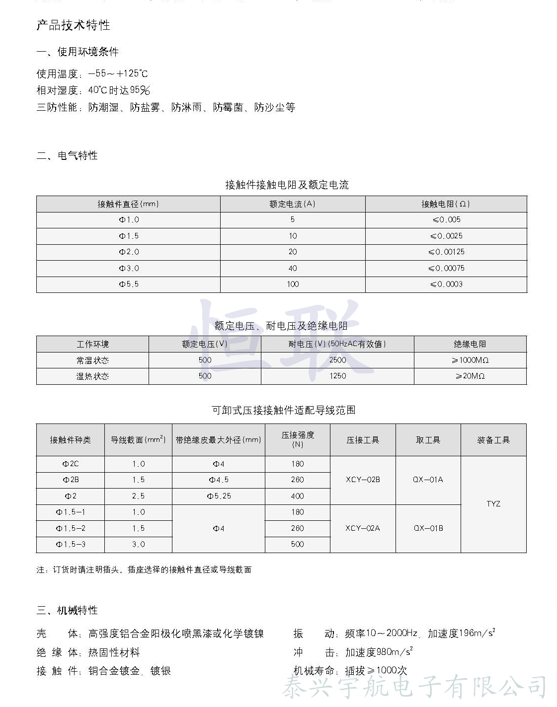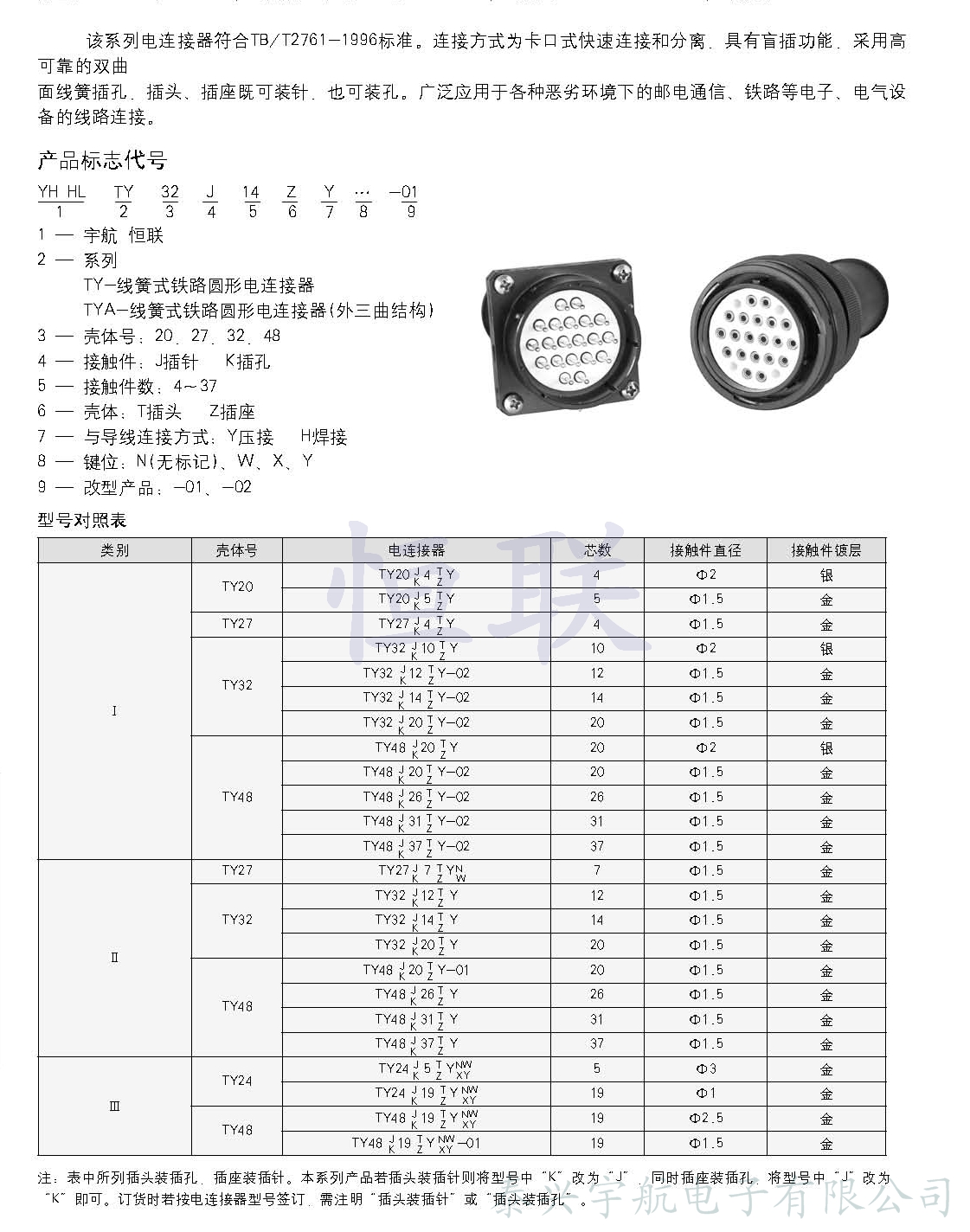 TY系列圓形電連接器采用高可靠的雙曲面線簧作為接觸件,產(chǎn)品具有接觸電阻小、插拔力柔和、抗振動(dòng)耐沖擊、高可靠等優(yōu)點(diǎn),產(chǎn)品主要技術(shù)指標(biāo)符合鐵道部標(biāo)準(zhǔn)TB/T2716-1996。 該系列電連接器插頭與插座的連接為卡口式快速連接,使用簡(jiǎn)單,操用方便,產(chǎn)品被廣泛使用于鐵路、電力等電氣及電子設(shè)備中的連接。根據(jù)客戶(hù)要求,插頭、插座既可裝針,也可裝孔